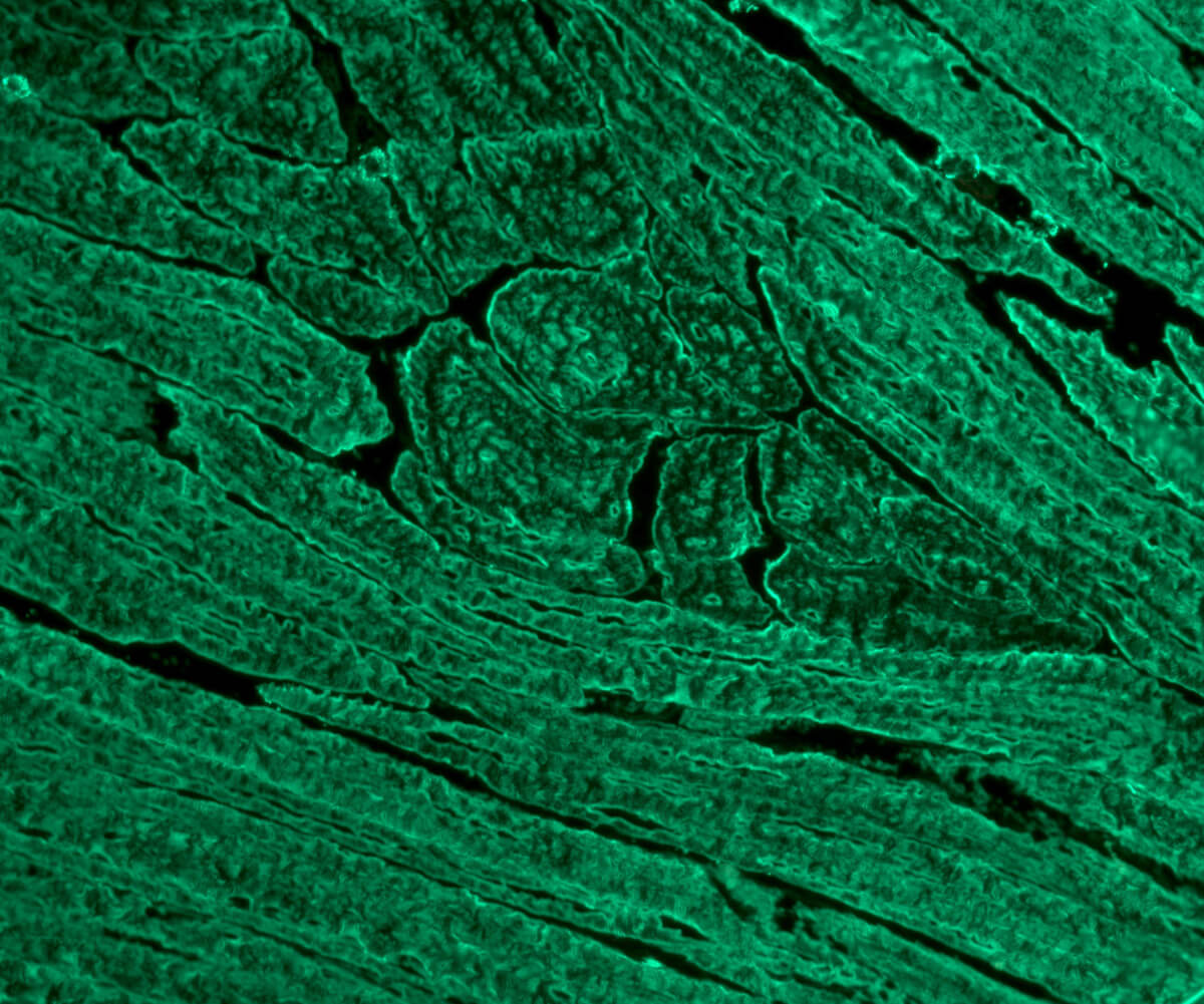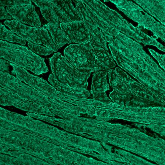 Objektträger beschichtet mit Skelettmuskulatur-Gewebeschnitten (Ratte) zum Nachweis von Antikörpern gegen Skelettmuskulatur aus Serum oder Plasma mittels Immunfluoreszenz.