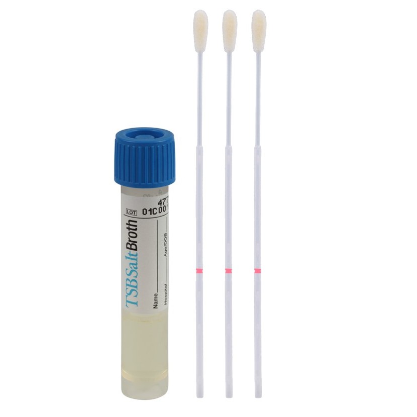 Copan TSB-Salz Bouillon basiert auf einer Casein- & Sojamehlpepton-Bouillon, angereichert mit 2,5 % NaCl. Es kann zur Anreicherung von S. aureus spp. eingesetzt werden. Andere Mikroorganismen können partiell im Wachstum inhibiert werden. Nach entsprechender Inkubation kann die Probe auf Nährstoff- oder Selektivagar ausplattiert werden.