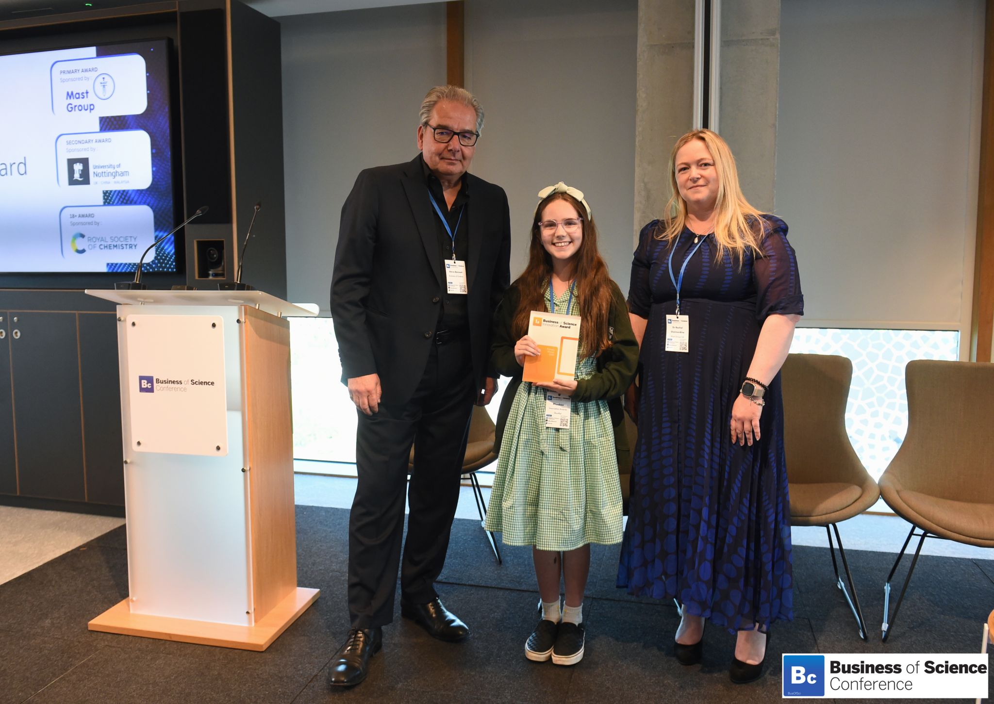 📸 Photos show Rachel Shelmerdine from Mast Group presenting the award to Phoebe alongside Steve Bennett from Business of Science